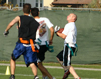BLAME GAME: Patrick got, shall we say, “toasted” a few times and each time we would hear White team Brent scream “Chainsaw!” (Patrick’s nickname). So on one play Brent was awfully quiet when a pass hit him in the hands and was intercepted. We were all hoping Patrick would scream, “Brent!” Brent made up for it by catching the game-winning 2-pointer on his knees (a preferred position).